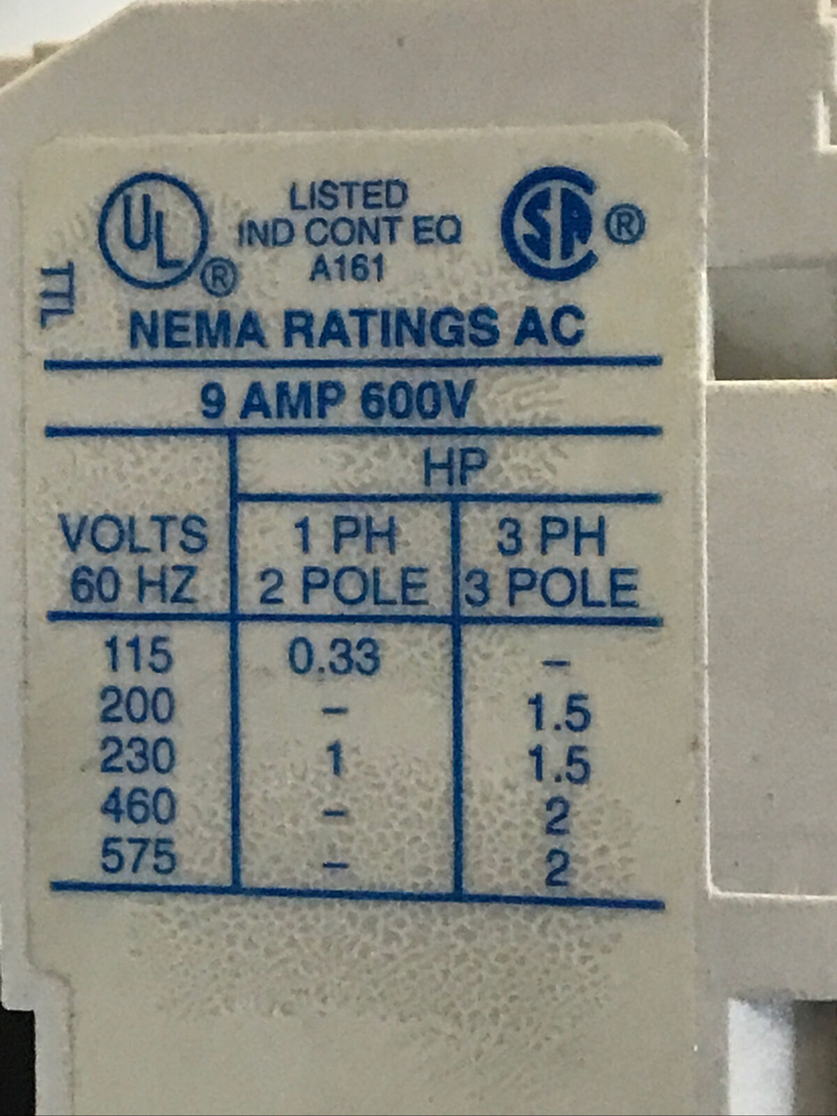 Eaton Cutler-Hammer A10AN0AD 9A 600V Magnetic Motor Starter Overload Relay.