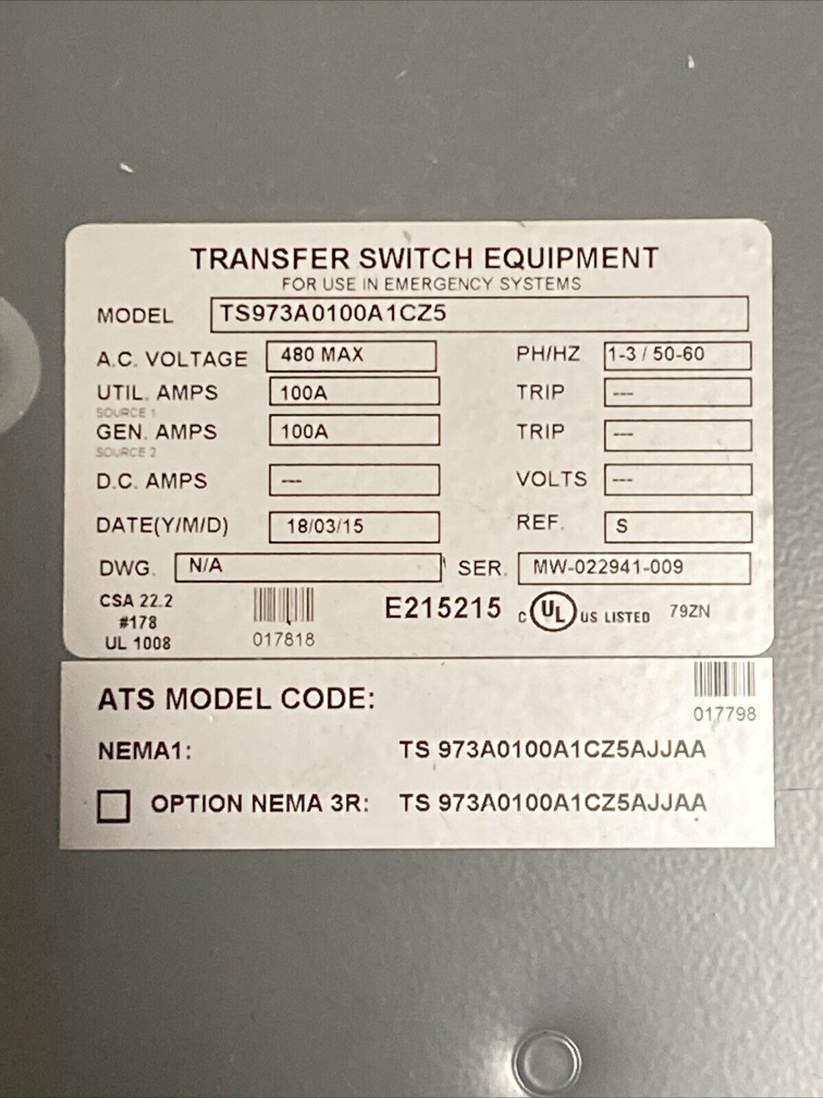 Thomson TS973A0100A1CZ5 Automatic Transfer Switch 480AC 100Amp 1-3Ph 50-60HZ