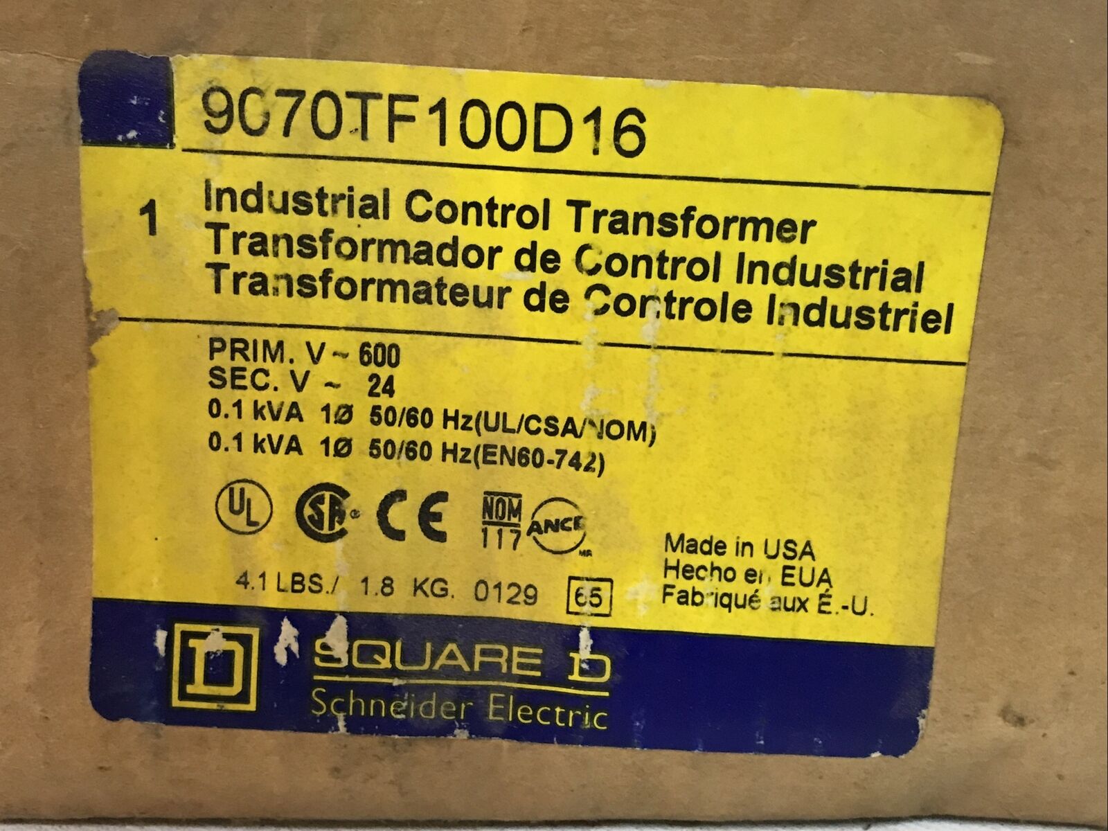 SQUARE D 9070TF100D16 Industrial Control Transformer 600V-24V *Sealed Box*