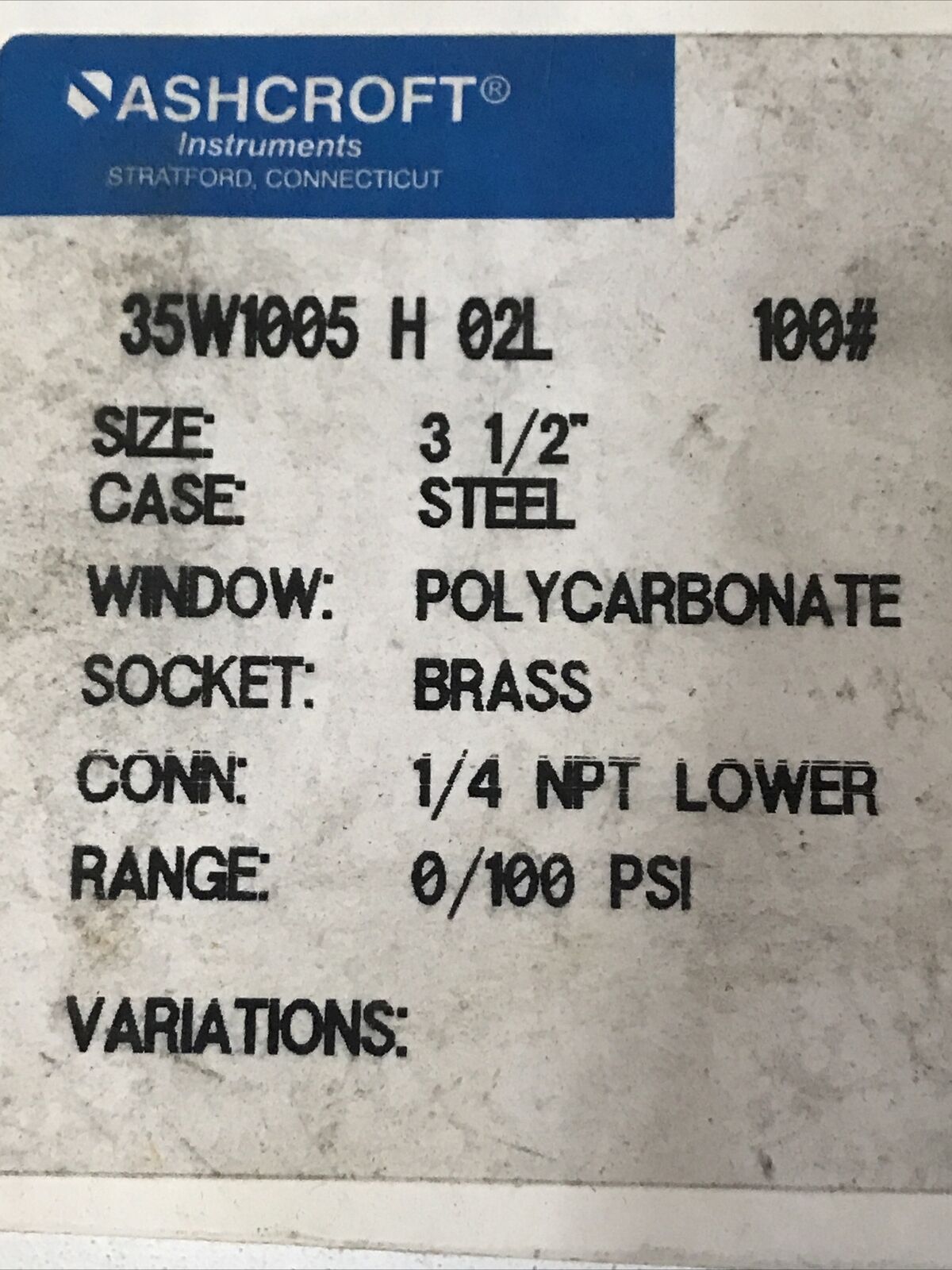Ashcroft 35W1005 H 02L 100# Pressure Gauge 3-1/2in 0-100psi 1/4in Npt
