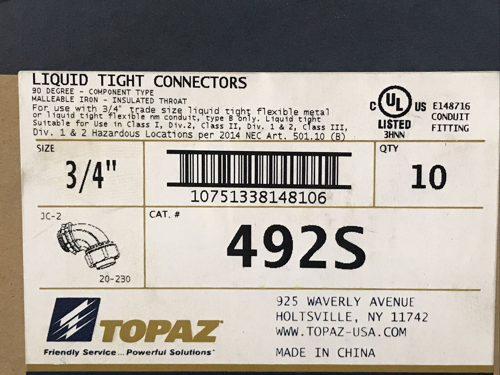 *BOX OF 5* Topaz 492S Liquid Tight Connector 3/4" Angle 90 Degree
