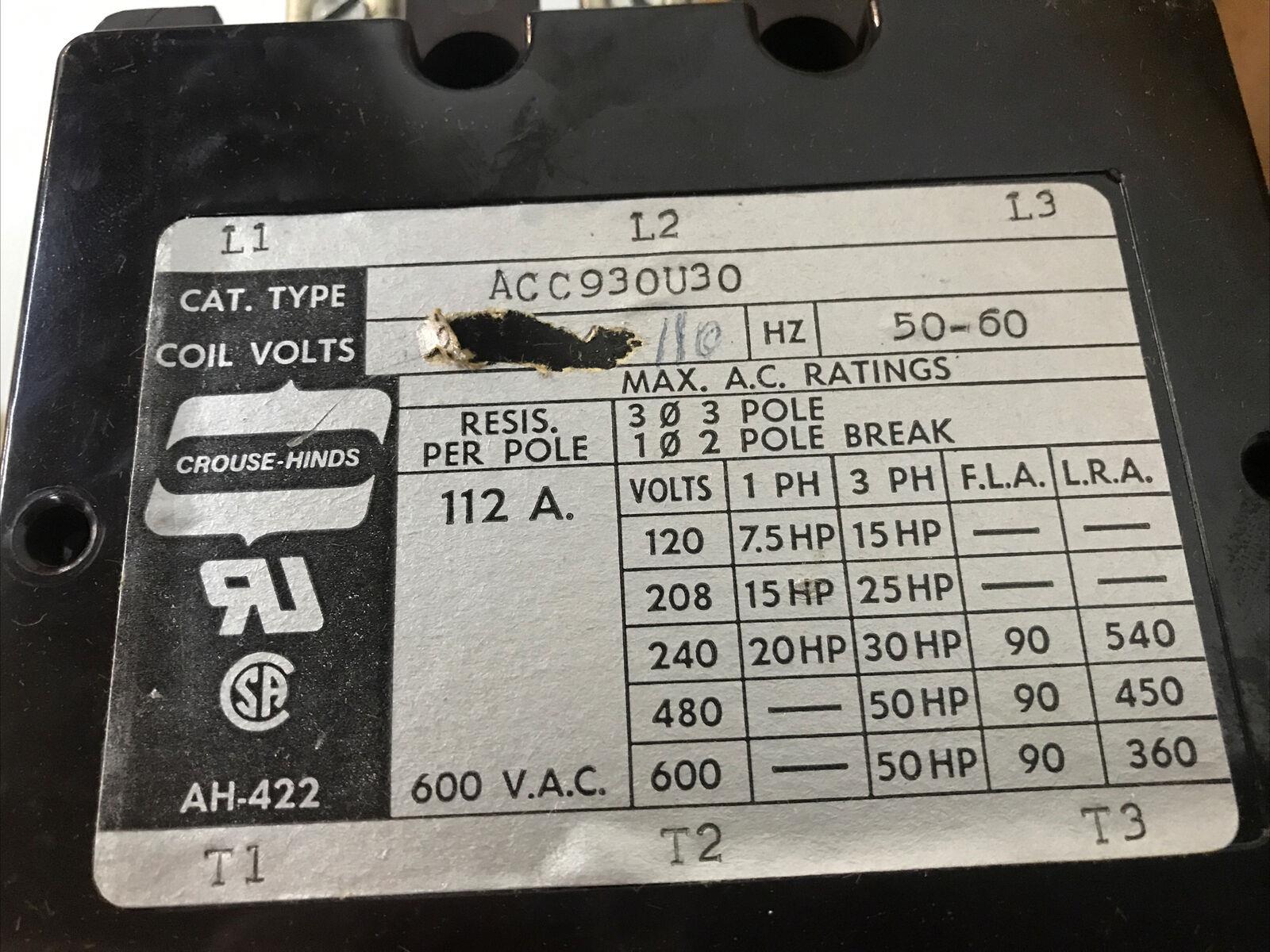 CROUSE-HINDS Arrow Hart ACC930U30 Contactor 600 VAC 112A 3P