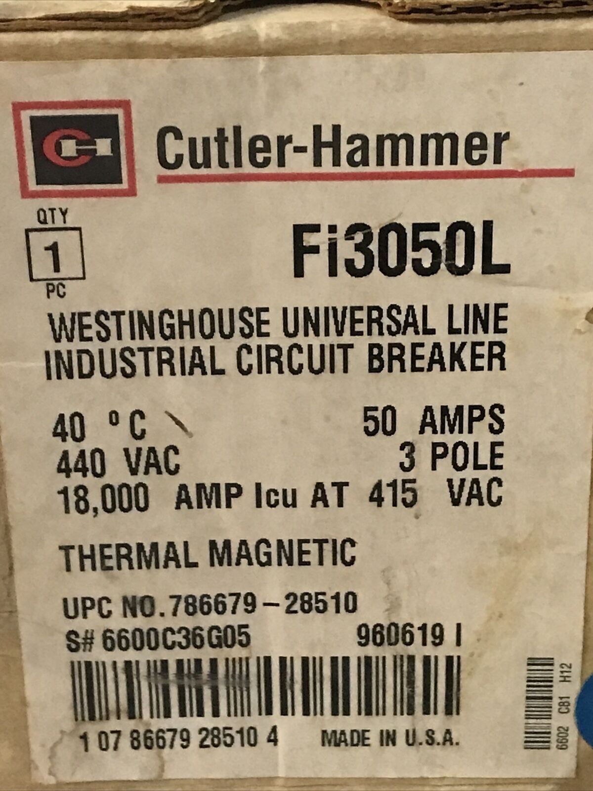 Cutler Hammer FI3050L Universal Line Circuit Breaker 3 Pole 50A 440VAC