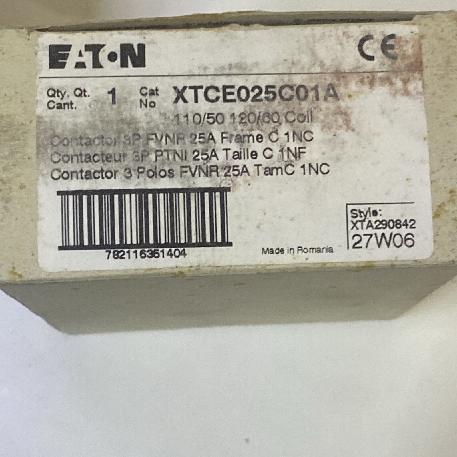 Eaton XTCE025C01A 110/120Vac Non-Reversing IEC Magnetic Contactor 3P 25A