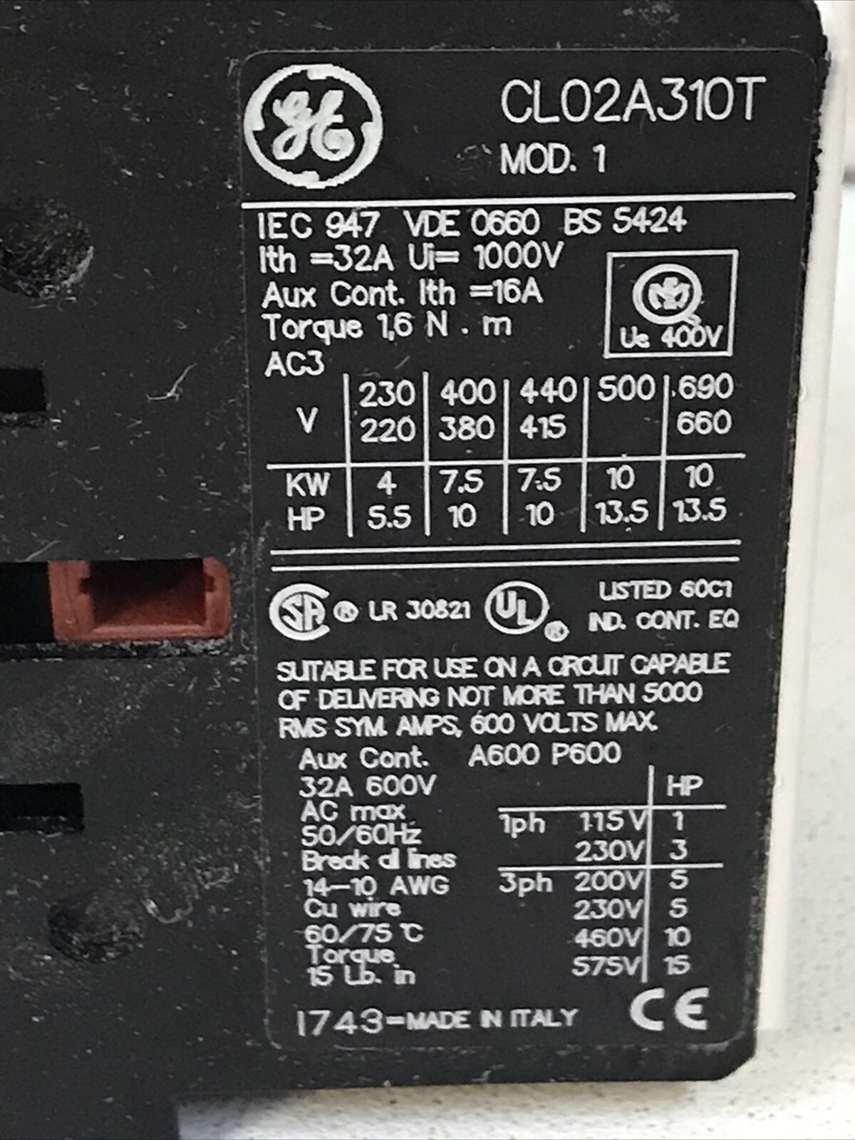 GE CL02A310TL 3 Pole Contactor with 208V Coil 109307