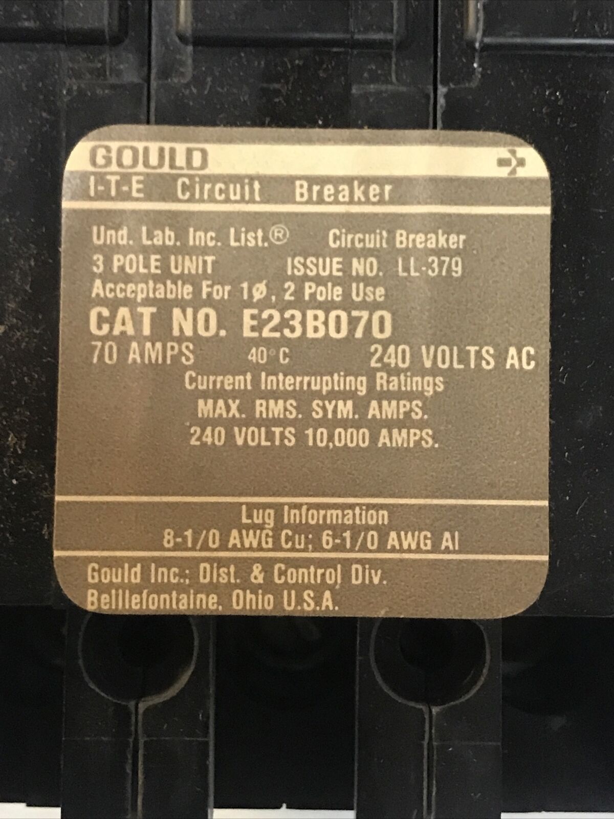 Gould E23B070 3 Pole 70A 240V I-T-E Molded Case Circuit Breaker E2 Frame