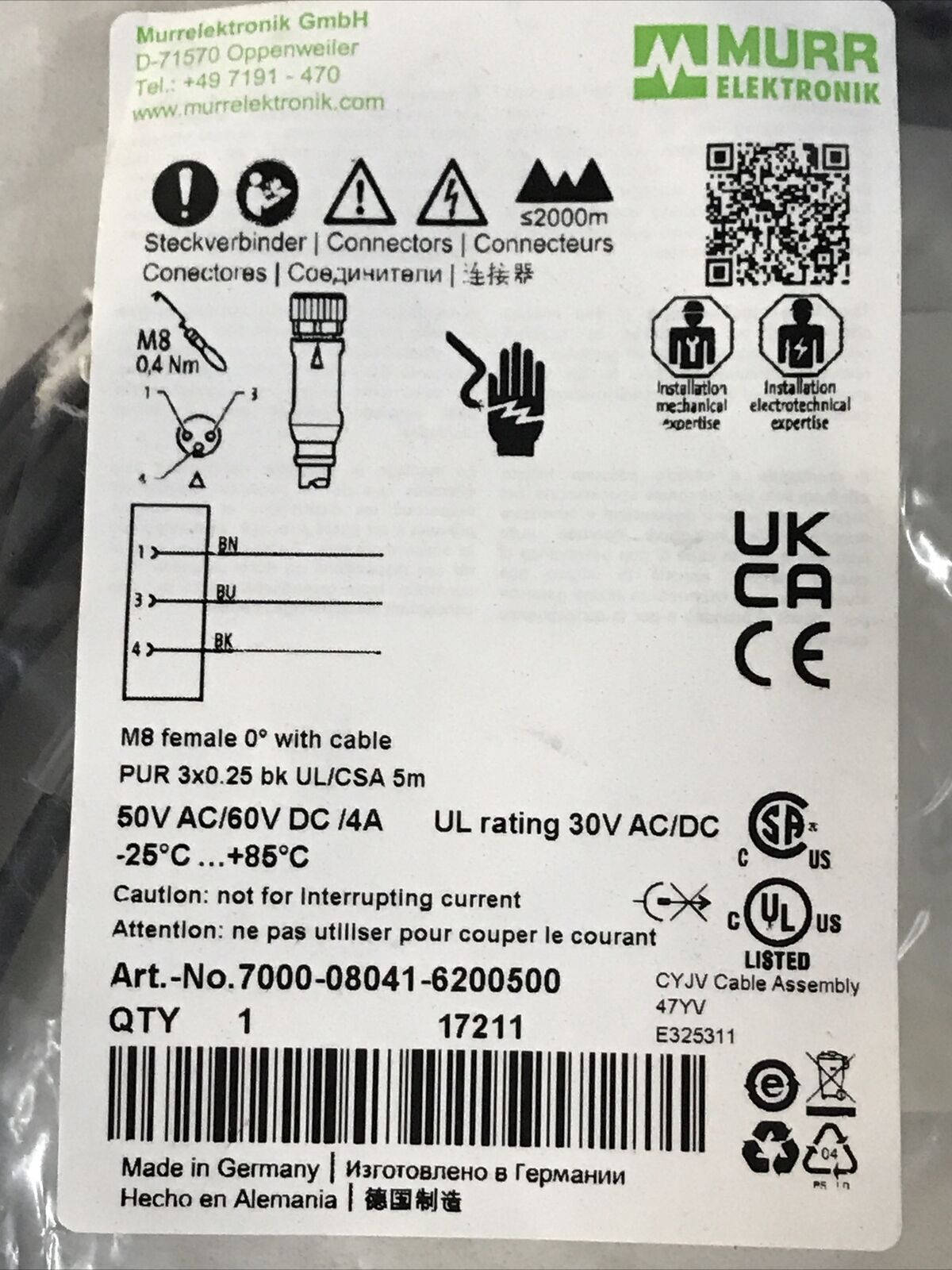 MURR ELEKTRONIK 7000-08041-6200500 M8 Female 0 Degree Cable 50V AC/ 60V DC 4A.