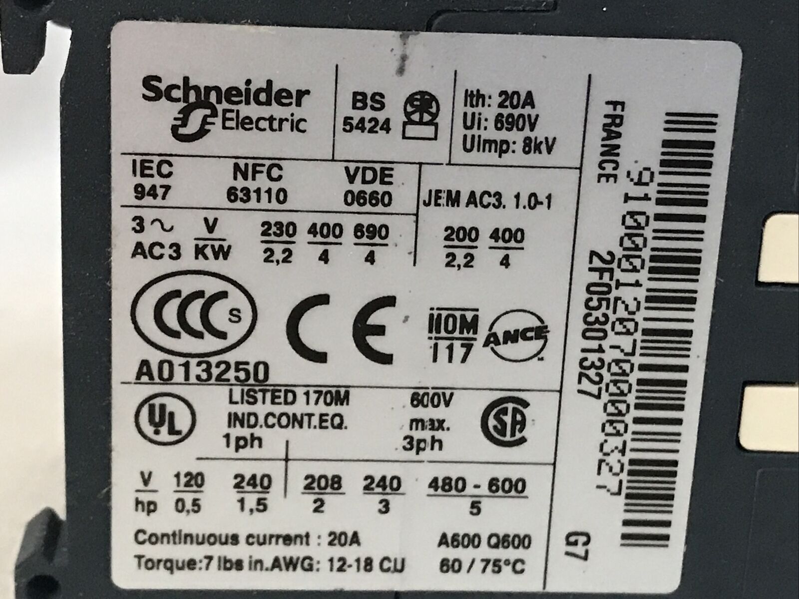 Schneider LC1K0910G7 Electric Miniature Contactor 120V 20A/4kW 380/415V 5HP-480V