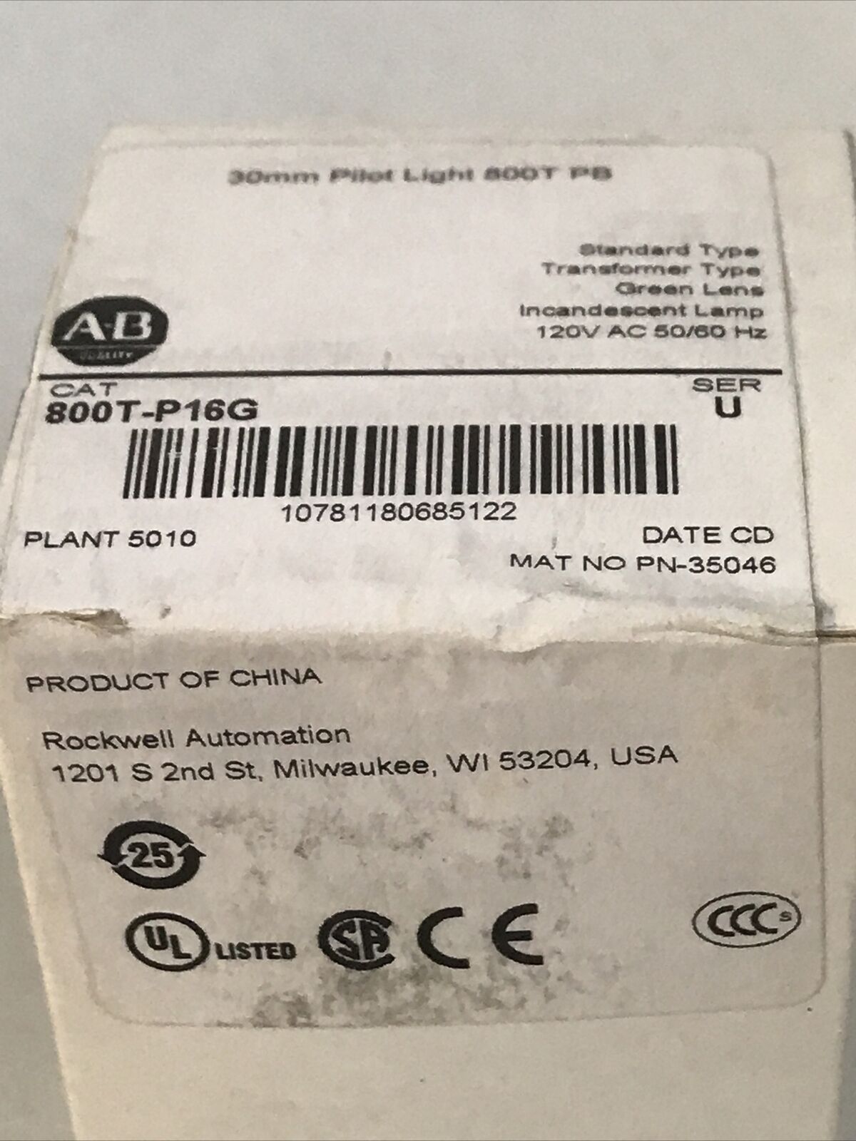 *SEALED* Allen Bradley 800T-P16G Series U 30mm Pilot Light 800RP16G