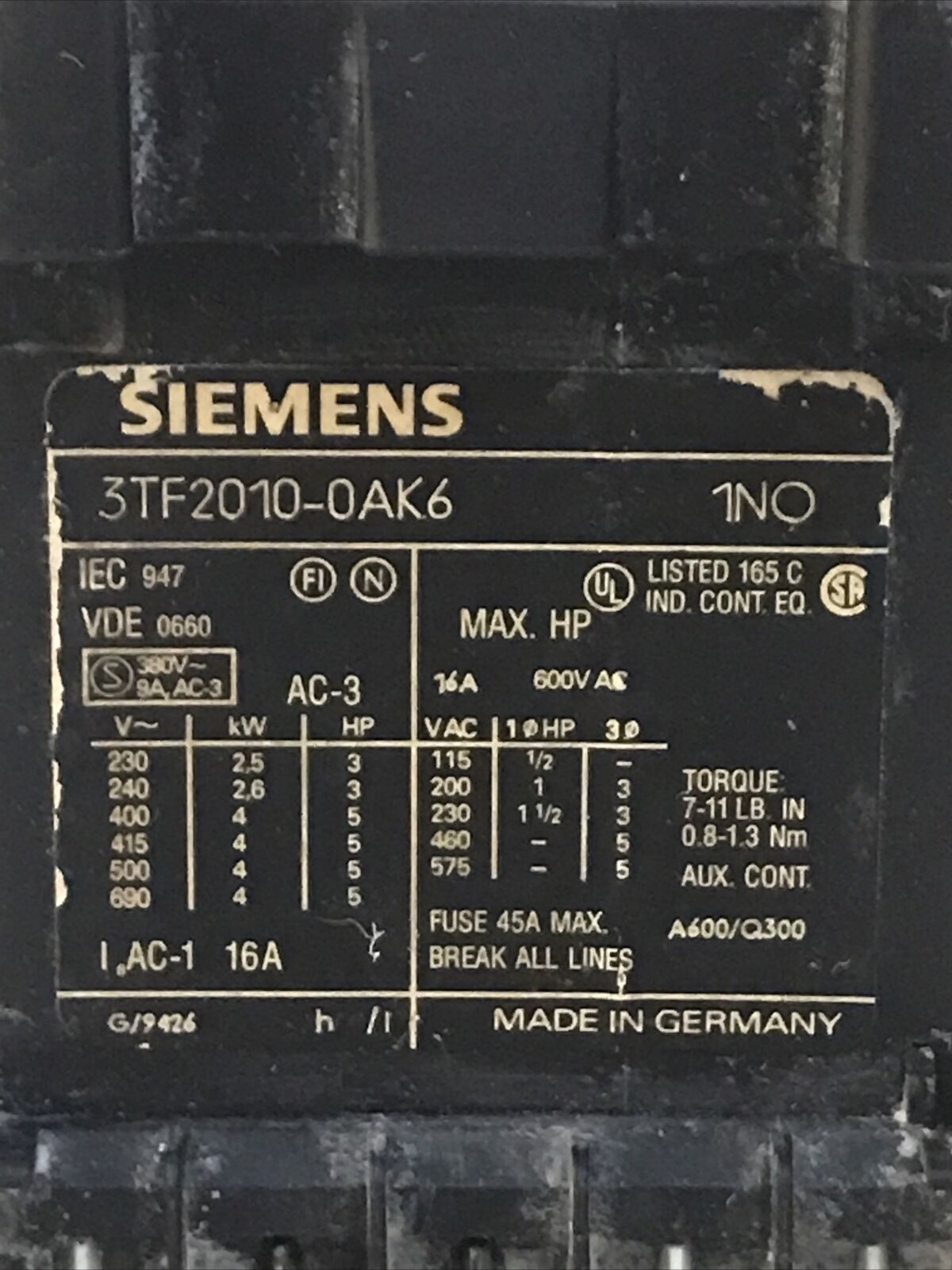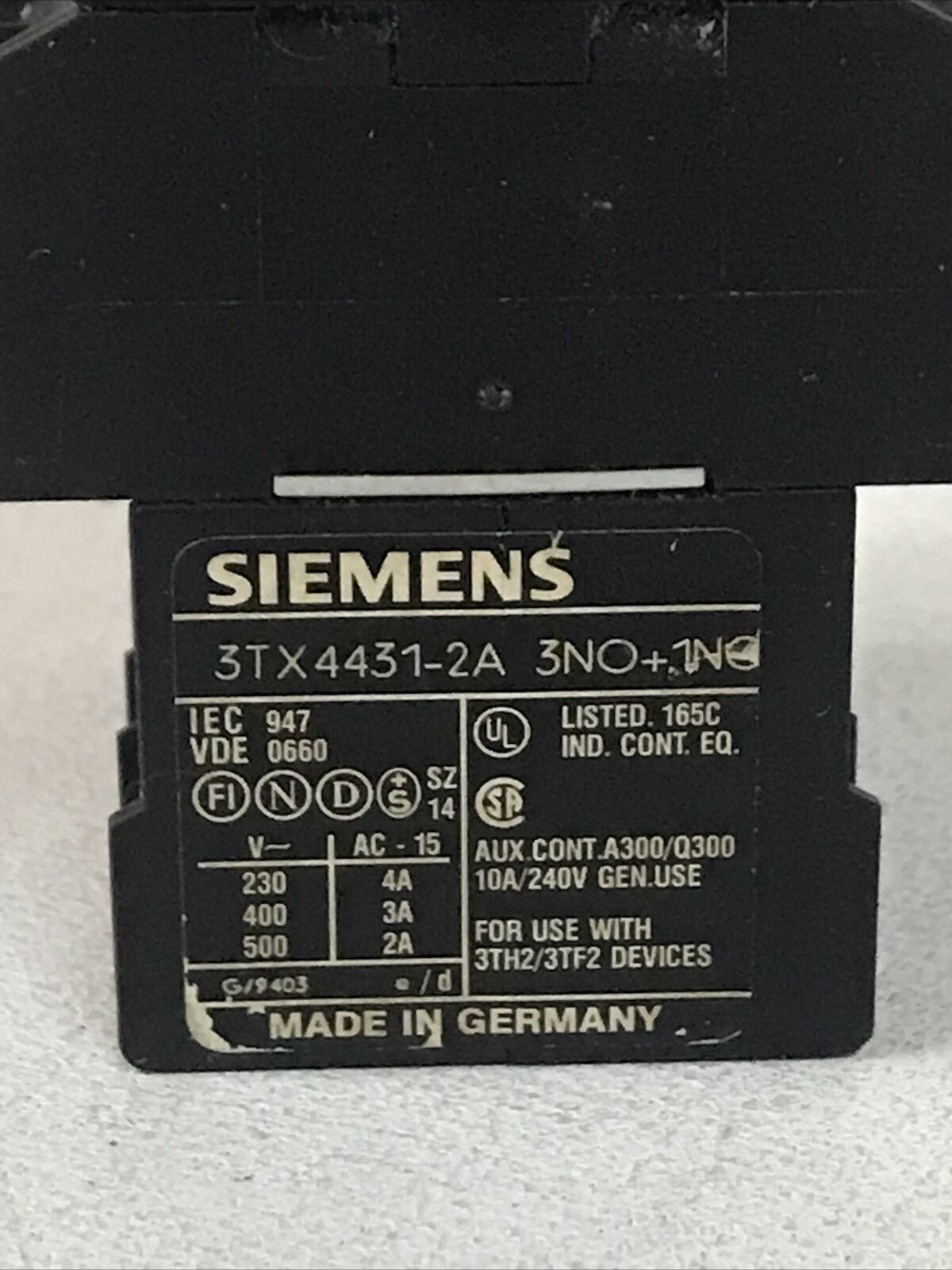 Siemens 3TF2010-0AK6 Contactor 1NO & 3TX4431-2A Auxiliary Contactor 3NO 1NC