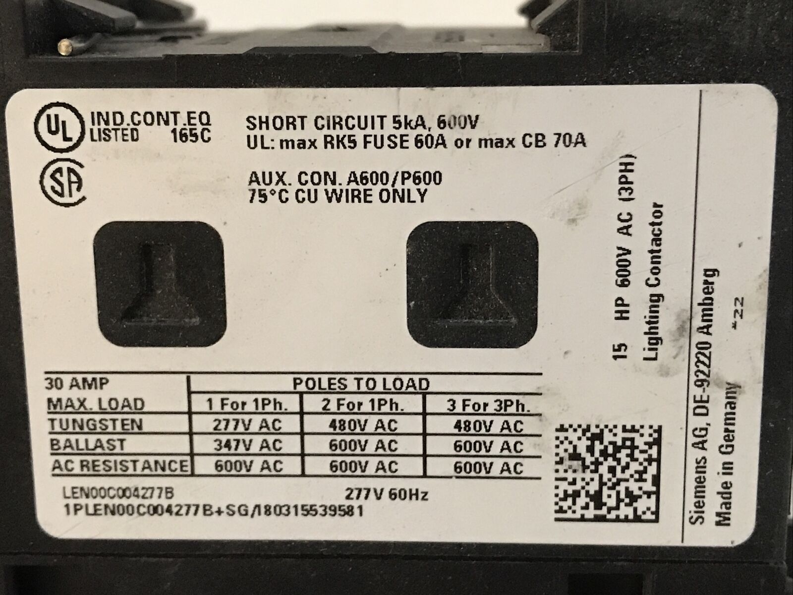 Siemens LEN00C004277B Lighting Contactor 30A 4P 600V 3PH Coil 277V Panel Mount