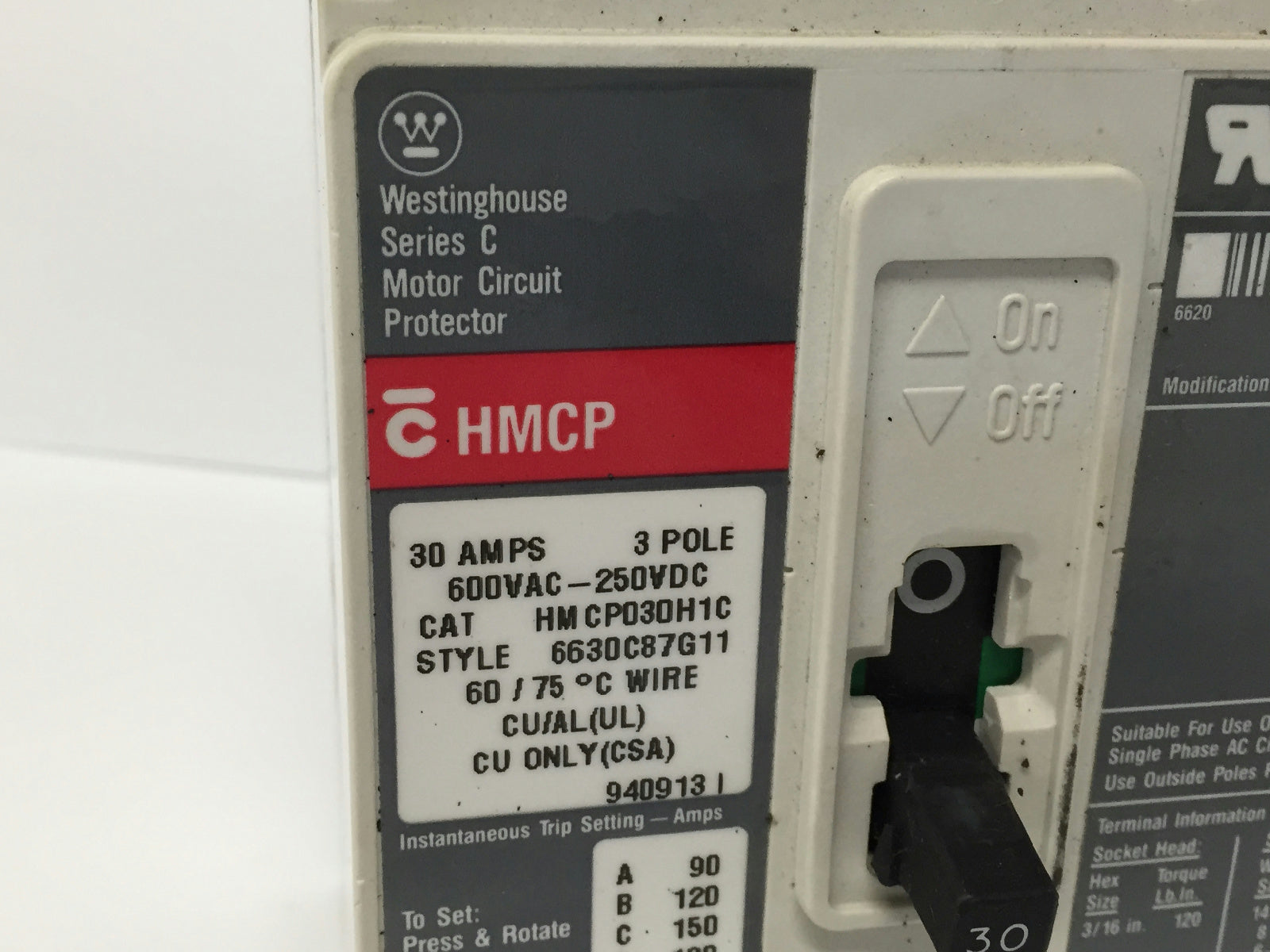 Westinghouse HMCP030H1C 6630C87G11 SER C 3P 30A AMP 600V Circuit Breaker